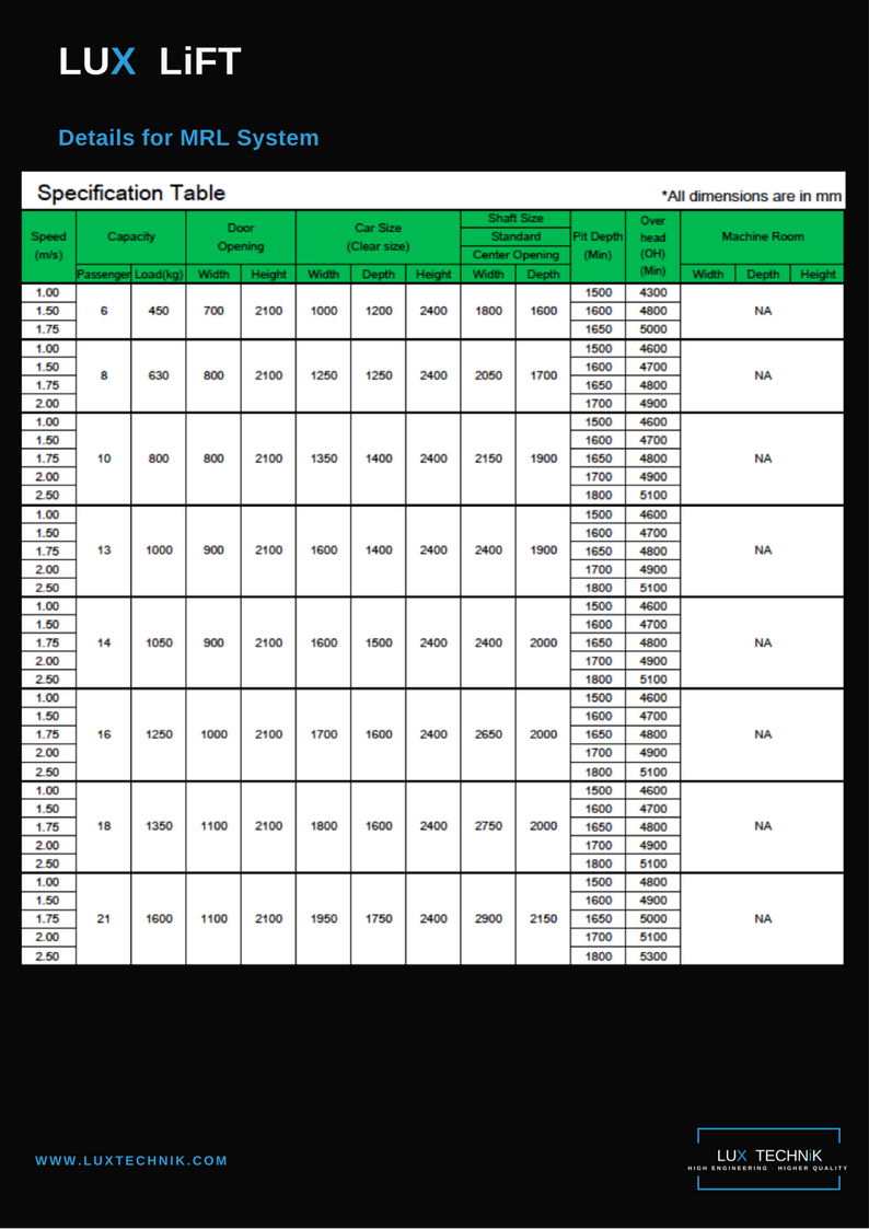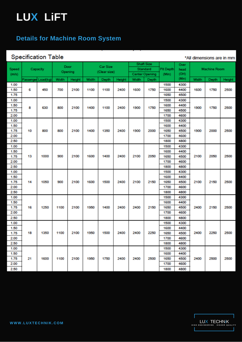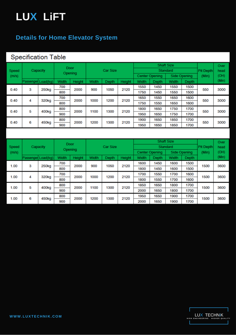 The LUX LiFT Specification Table